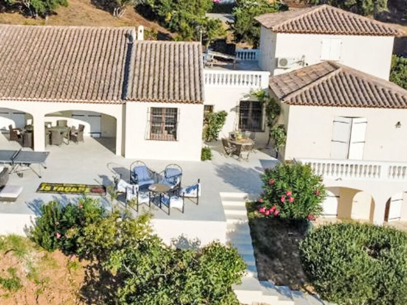 "Villa Resedas", villa 6-kamers 350 m2 op 2 verdiepingen, op het oosten gelegen. Ruim en licht, comfortabel en mooi ingericht: groot woon-/eetkamer met open haard (alleen decoratie), TV (Flatscreen TV). Uitgang naar het terras. 1 kamer met Kleedkamer met 1 2-pers bed (2 x 80 cm, lengte 190 cm), TV (Flatscreen TV). Uitgang naar het terras. 1 kamer met 1 2-pers bed (180 cm, lengte 200 cm), TV (Flatscreen TV). Studio met 1 x 2 stapelbedden (80 cm, lengte 190 cm), kookhoek, douche/WC en air-conditioning. Keuken (oven, afwasmachine, 4 keramische glas kookplaten, broodrooster, waterkoker, magnetron, diepvriezer, elektrische koffiemachine). Aparte WC, bad/douche/WC, dubbele wastafels. Air-conditioning. Souterrain: 1 kamer met 1 2-pers bed (140 cm, lengte 190 cm), douche/WC, dubbele wastafels en TV (Flatscreen TV). Uitgang naar het terras. Bovenverdieping: 1 kamer met 1 2-pers bed (180 cm, lengte 200 cm), douche/WC en TV (Flatscreen TV). Uitgang naar het terras. Groot terras 500 m2, op het zuiden gelegen en op het oosten gelegen terras 20 m2, op het oosten gelegen. Terrasmeubelen, barbecue. Zeer mooi uitzicht op zee en het landschap. Ter beschikking: wasmachine, droger, strijkijzer, kinderstoel, haardroger. Internet (WiFi, gratis). Parkeerplaats, garage (1 Auto). Eén tweepersoonskamer is buiten het appartement. Rookvrij huis. Maximaal 1 huisdier/hond toegestaan. TV alleen FR. Rookmelders. Geen interne verbinding tussen de aparte wooneenheden. Aanbod door een commerciële eigenaar volgens art. 155, IV, CGI 83019002292TN