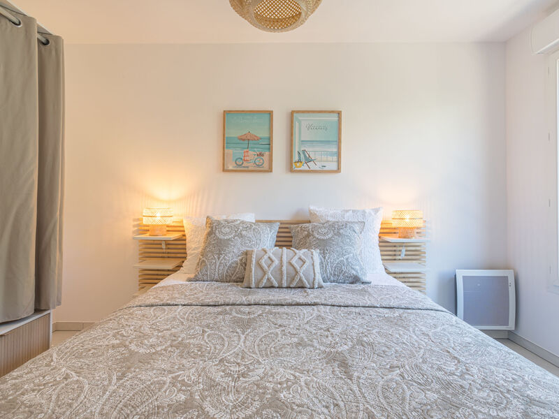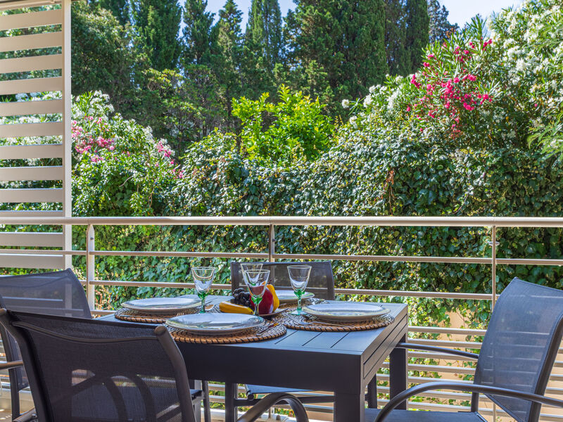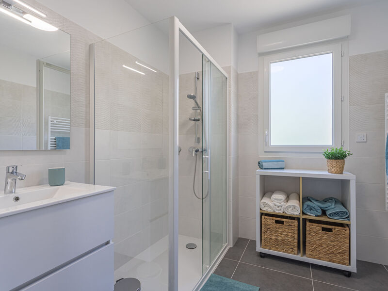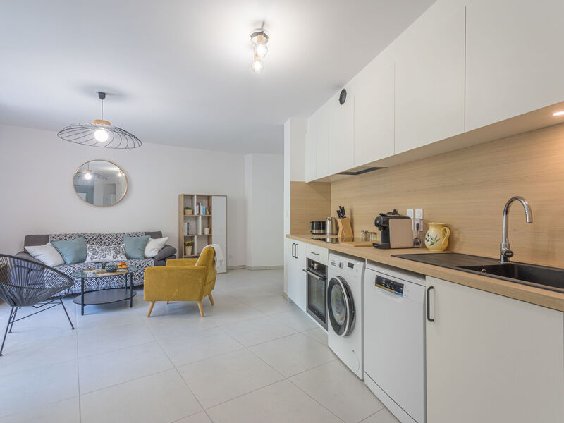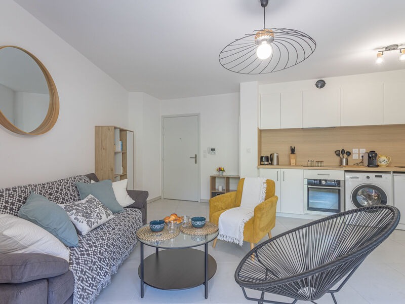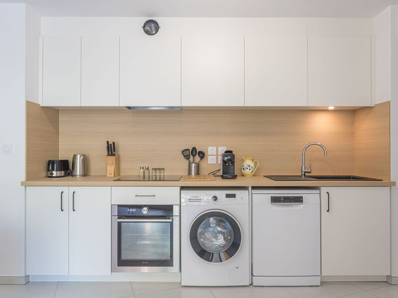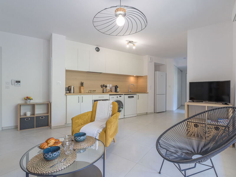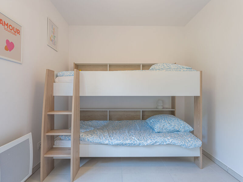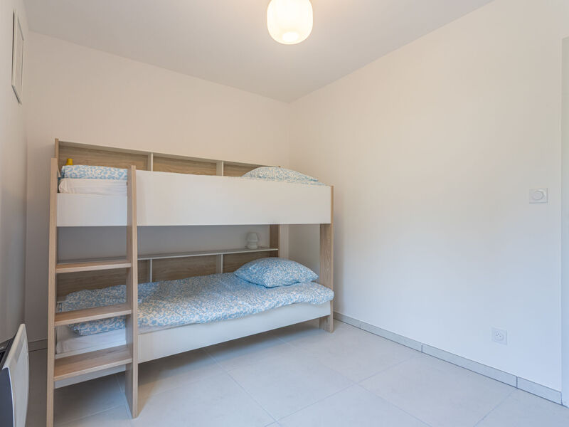 Appartement 3-kamers 50 m2 op de 1e verdieping. Licht, comfortabel ingericht: woon-/eetkamer met TV (Flatscreen TV), air-conditioning. Uitgang naar het terras. 1 kamer met 1 2-pers bed (160 cm, lengte 190 cm). 1 kamer met 1 x 2 stapelbedden (90 cm, lengte 190 cm). Open keuken (oven, afwasmachine, 3 inductiekookplaten, broodrooster, waterkoker, magnetron, elektrische koffiemachine). Douche/WC. Elektrische verwarming. Terras 8 m2, op het zuidoosten gelegen. Terrasmeubelen. Ter beschikking: wasmachine, strijkijzer, haardroger. Internet (WiFi, gratis). Garage nr. 2 (2 Auto's), hoogte 194 cm, breedte 280 cm. Niet rokers woning. Rookmelders.